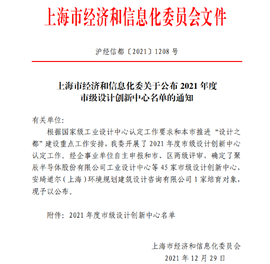 12月29日,上海市经济和信息化委员会公布了2021 年度市级设计创新中心名单。经过网上申报、区级推荐和市级评审等一系列严格的评审流程,至尊国际·(中国)至尊服务,至尊享受 工业设计中心获评市级企业设计创新中心,成为2021年收官之际的又一重大喜讯。