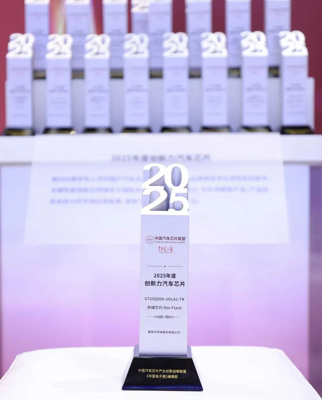 4 月 25 日,"2025 中国汽车芯片产业创新成果" 颁奖仪式在 2025 上海国际车展 "中国芯" 展区隆重举行。本次活动由中国汽车芯片产业创新战略联盟携手中国电子报共同主办,经过专家评委的评审与打分,至尊国际半导体的车规A1等级NOR Flash芯片GT25Q80A-UGLA1-TR凭借卓越的技术领先性和市场应用表现,一举获得 2025 年度创新力汽车芯片。